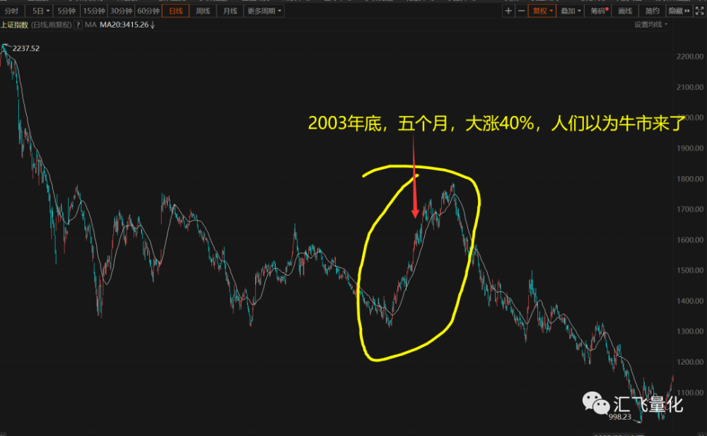 最可怕的:不是下跌,而是下跌途中的反弹,尤其是强力反弹,让你误判,以为牛市卷土重来了,然后重仓杀入,结果财富灰飞烟灭。最经典的案例就是:2003年那一波: