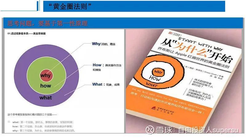 这个why-how-what的模型是我们思考问题非常好的一个模式,被称之为“黄金圈法则”,源自美国作家西蒙.斯涅克的《从为什么开始》一书。书中主要通过苹果等公司的事例,深刻的向我们揭示,我们思考问题,要透过现象看本质,要从第一性原理出发,从最本质的地方出发,先问为什么,再是怎么样,之后才是现象和成果。这是蛮重要的一个问题的。(演绎法)