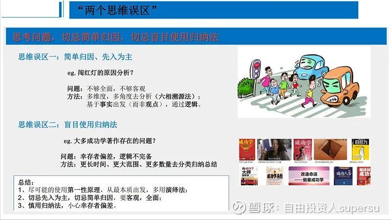 说到思考问题的方式,平时逛雪球,也发现两种比较常见的思维误区:一种是简单归因,先入为主。一种是盲目使用归纳法。