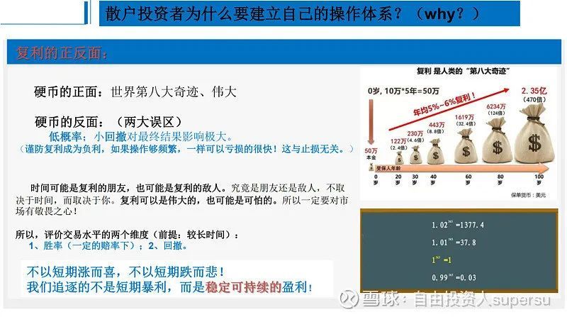 除此之外,不得不提醒的一点,要谨防复利变成负利,只要每次亏一点,如果次数够多,一样可以亏损很快,这个和设不设止损没关系。(关键在于胜率,胜率取决于你的认识模式等)