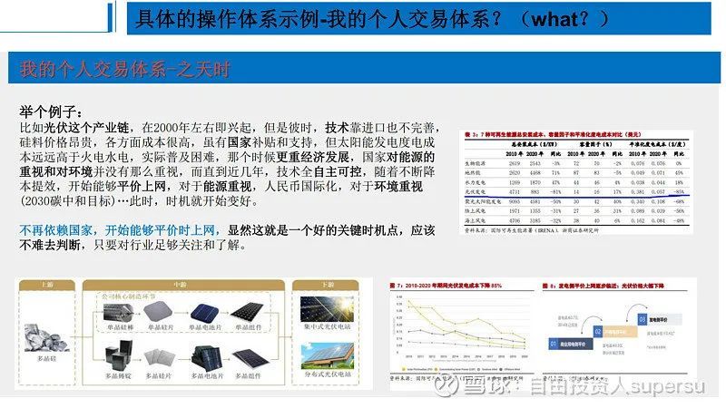 举个例子:比如光伏这个产业链,在2000年左右即兴起,但是彼时,技术靠进口也不完善,硅料价格昂贵,各方面成本很高,虽有国家补贴和支持,但太阳能发电度电成本远远高于火电水电,实际普及困难,那个时候更重经济发展,国家对能源的重视和对环境并没有那么重视,而直到近几年,技术全自主可控,随着不断降本提效,开始能够平价上网,对于能源重视,人民币国际化,对于环境重视(2030碳中和目标)…此时,时机就开始变好。