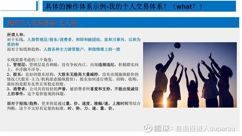 所谓人和,对于长线,人指:管理层/股东/消费者,和即:和睦团结,家和万事兴,以和为贵的和而对于短线和趋势:人指各种主力游资散户,和指情绪上的一致 (短期走势中,一般情况,管理层和消费者相对恒定的,所以得主要看股东情况,看主力游资散户)