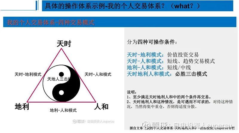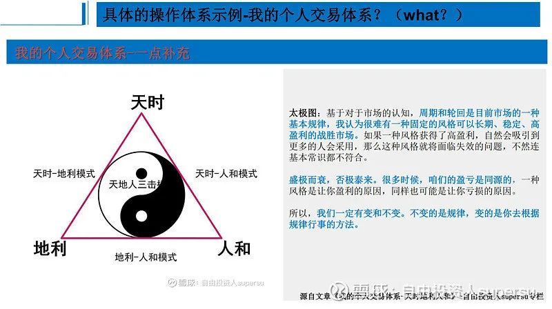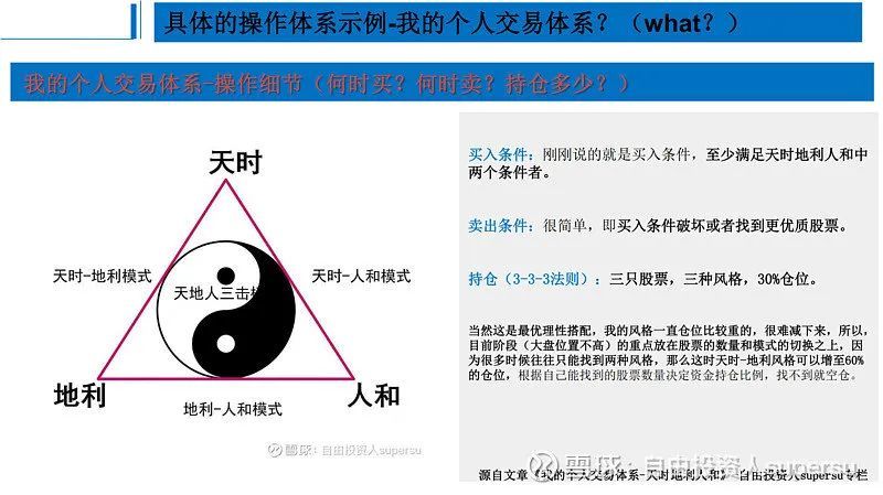 我的交易体系就6个字:天时地利人和。具体的论述在这篇文章,《我的个人投资体系-天时地利人和》,大家可以参考。