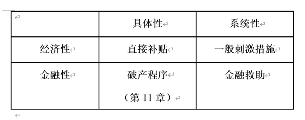 作者认为,为了应对下一场可能到来的危机,政府必须从这一次疫情施策中吸取教训——即为缓解困境所采取的工具选择应当取决于具体问题的性质,而非一概采取零碎的解决办法。政府在应对2020年疫情所导致的危机时,忽略了两个重要差别,一是区分解决金融市场困境与解决经济市场困境的工具之间的差异;二是区分困境蔓延所形成的系统性危机与具体公司困境的差别。注意到这两处差别后,可以将市场困境进而细化为四种类型:具体经济困境、系统经济困境、具体金融困境、系统金融困境。每种类型都有相应的应对措施,分别是:直接补贴、一般刺激措施、破产程序与金融救助。如此便形成了这样一个矩阵: