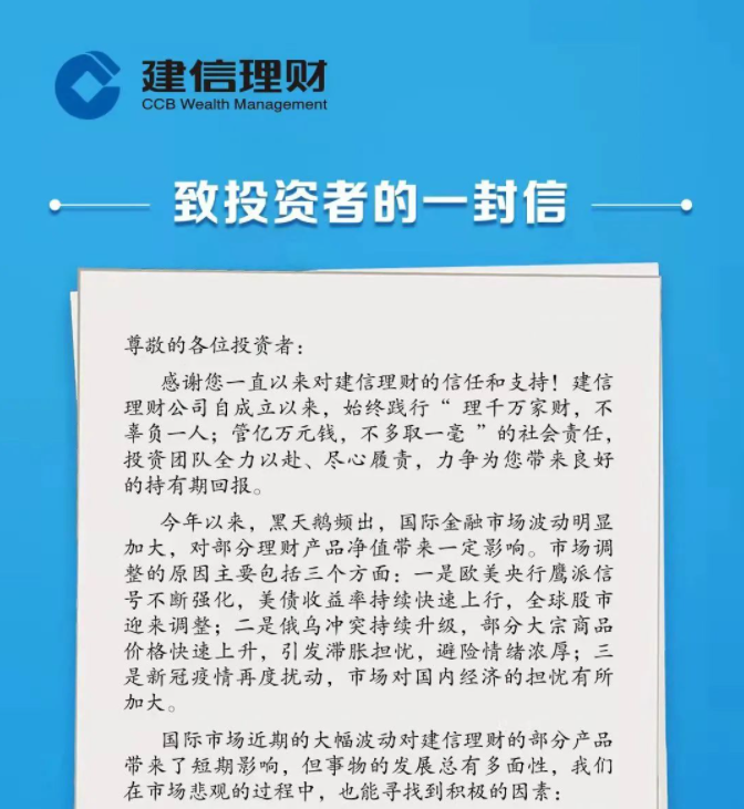 “风物长宜放眼量,市场永远风险与机遇并存,短期的震荡不能改变中国资本市场长期向好的趋势。未来的日子里,让我们用专业的能力、优异的成绩、温暖的陪伴助您投资淡定从容!”这段“淡定从容”的内容来自建信理财日前发布在的“致投资者的一封信”。