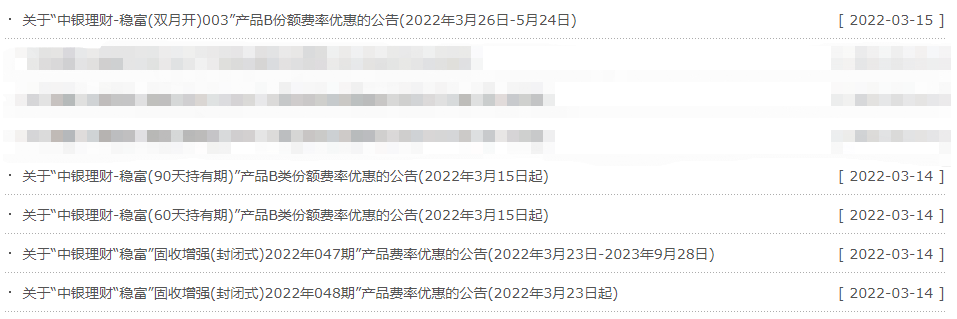 3月14日和15日,中银理财连续发布多个公告表示,计划对中银理财多个产品的销售服务费率(年化)进行下调,由0.30%下调至0.15%或0.10%不等;甚至将对一些产品的固定管理费(年化)由0.10%下调至0.00%。不过,公告也指出,费率优惠有截止时间,部分将在5月或9月等时间到期,部分优惠的截止时间将另行公告。
