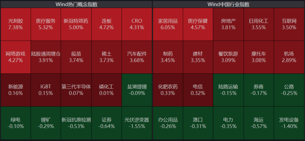 市场普涨之下,热点百花齐放。房地产主题爆发,房地产服务、房地产开发、装修建材等涨幅领先;新冠主题保持强势,新冠药物、中药等走势强劲。另外白酒、电池、医疗美容、游戏、数字货币等板块涨势靠前。大金融整体偏弱,券商概念小幅回调,另有光伏设备、航运港口、民爆概念收绿。