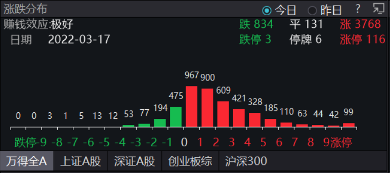 行情火热下,市场有3768股收涨,116股涨停,834股收跌,3股跌停。国证300涨幅略高于国证2000,核心资产走势更强。