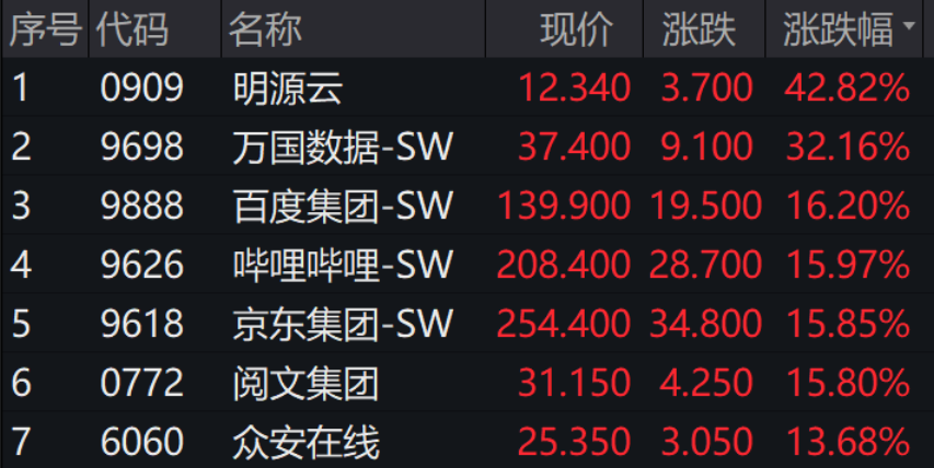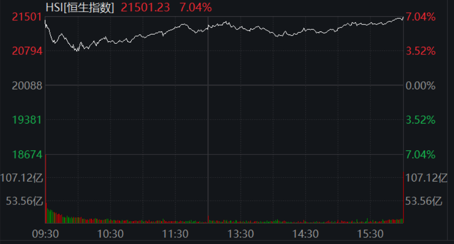 3月17日,港股延续昨日强劲表现,恒生指数早盘大幅高开后曾波动下行,涨幅收窄,所幸盘中走势转强,尾盘再收7.04%的涨幅,最新报21501.23点,另外恒生科技收涨7.76%,其中明源云收涨42.82%、万国数据-SW涨32.16%、百度集团-SW涨16.2%、哔哩哔哩-SW涨15.97%、京东集团-SW涨15.83%。