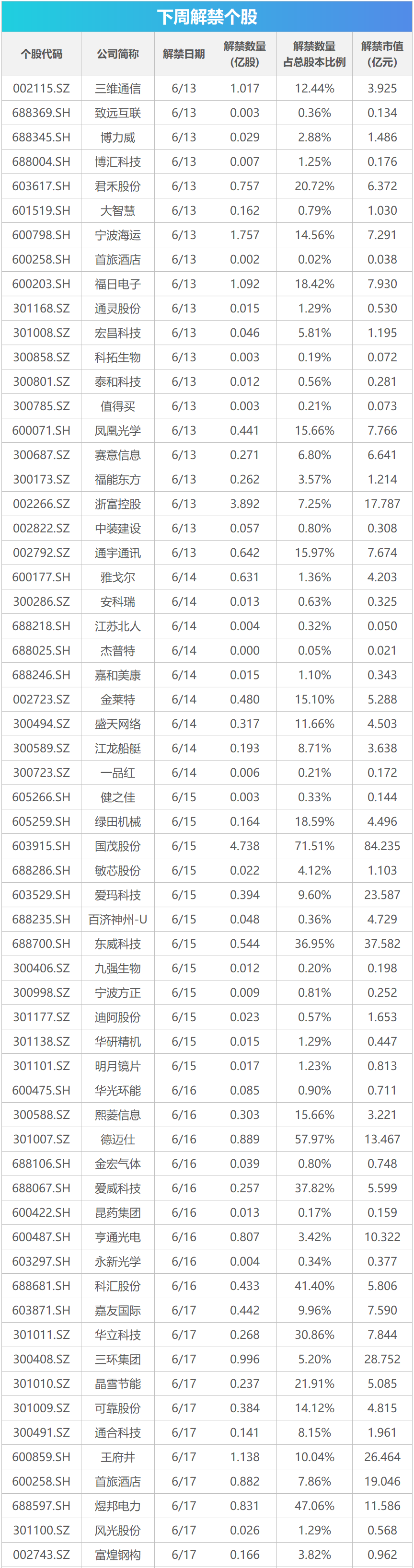 Wind统计显示,下周共有61家公司限售股陆续解禁,合计实际解禁量26.5亿股,按6月10日收盘价计算,解禁市值为404.8亿元。解禁市值居前三位的是:国茂股份(84.23亿元)、东威科技(37.58亿元)、三环集团(28.75亿元)。从个股的解禁量看,解禁股数居前三位的是:国茂股份(4.74亿股)、浙富控股(3.89亿股)、宁波海运(1.76亿股)。