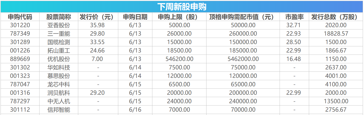 统计显示,下周将有11只新股发行。6月13日发行的是优机股份、三一重能、国缆检测、亚香股份、拓山重工;6月14日发行的是华如科技、慕思股份;6月15日发行的是中无人机、龙芯中科、润贝航科;6月16日发行的是信邦智能。
