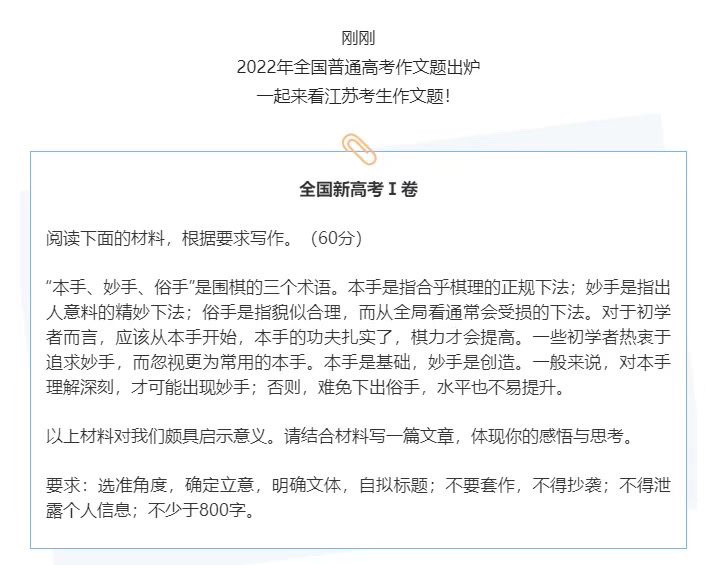 今年江苏卷讨论围棋对弈中的本手妙手俗手。