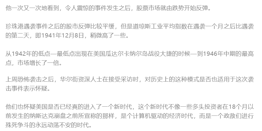 2001年9月16日《纽约时报》上刊载了一篇文章,题目是《投资,危机的见证人,紧急警告》,记者采访了许多经验丰富、深受信赖、成功而知名的华尔街资深人士,征求他们对9·11恐怖袭击事件的看法。