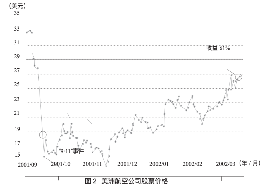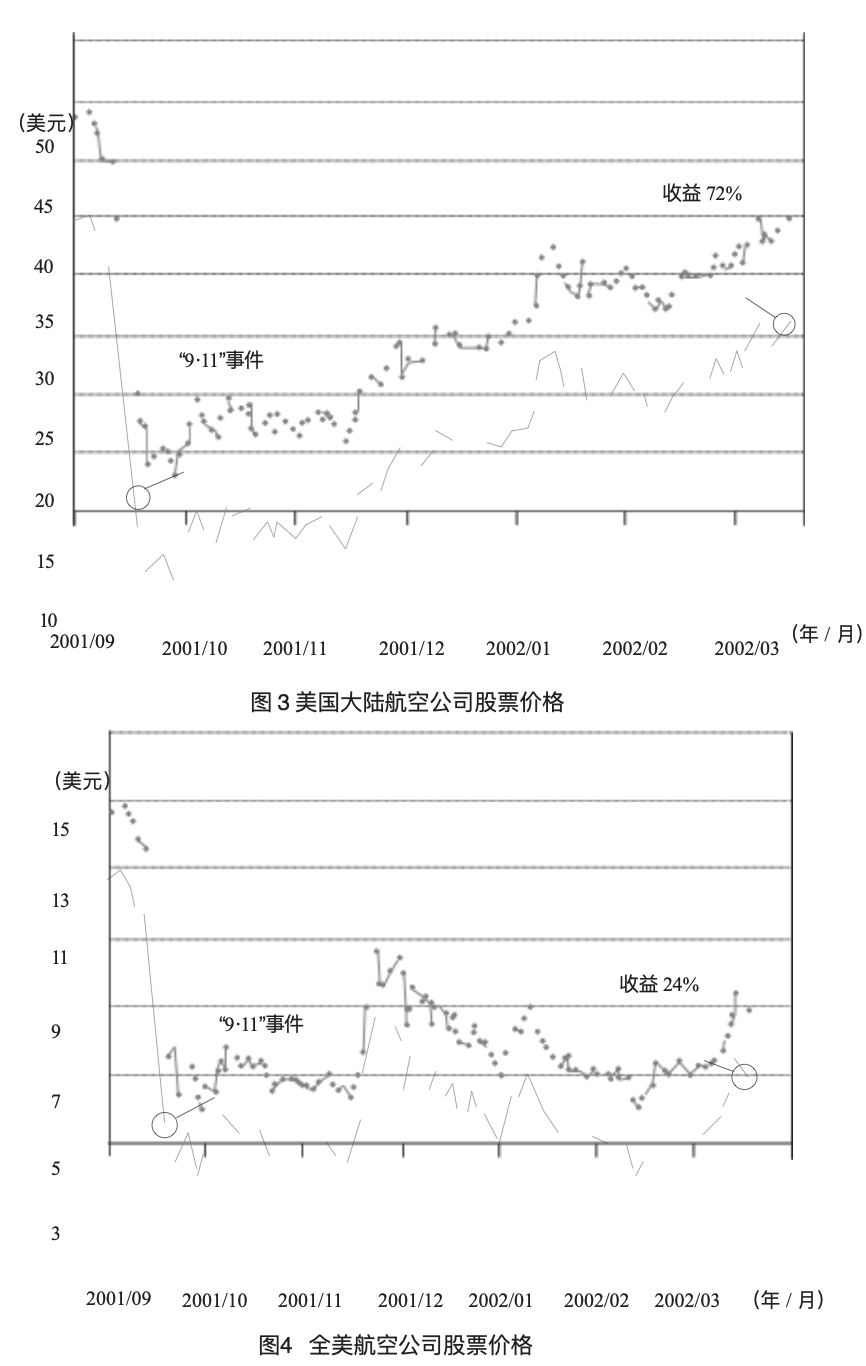 邓普顿买入的这3只股票分别是AMR公司(美洲航空公司的母公司)、美国大陆航空公司以及全美航空公司。图2-4显示出3只股票在2001年9月的价格,以及在2001年9月17日之后6个月内的价格,从中可以看到邓普顿计划的持股期给他带来的回报情况。