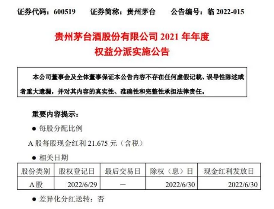 6月23日晚,贵州茅台发布《2021 年年度权益分派实施公告》,每股向投资者派发现金红利21.675 元(含税,下同),6月29日为股权登记日,6月30日为除息日。这意味着6月29日登记在册的贵州茅台投资者,都将可以获得每股21.675元的现金红利。受此消息的刺激,在6月24日的股票交易中,贵州茅台向2000元的股价发起冲击,收盘2009.01元,成功站在2000元之上。