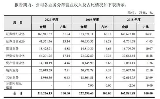 2018年、2019年和2020年,公司证券经纪业务收入分别为140,677.10万元、133,671.11万元和163,941.57万元,占公司营业收入的比例分别为84.81%、60.13%和51.84%。