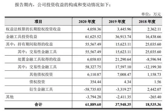 2018年、2019年、2020年、2021年,公司实现投资收益分别为18,535.36万元、37,948.35万元、61,889.60万元、22,922.66万元。