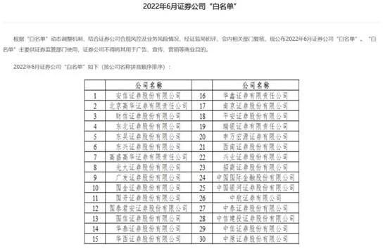 证监会网站显示,根据白名单动态调整机制,结合证券公司合规风控及业务风险情况,经证监局初评、会内相关部门复核,现公布2022年6月证券公司白名单。白名单主要供证券监管部门使用,证券公司不得将其用于广告、宣传、营销等商业目的。