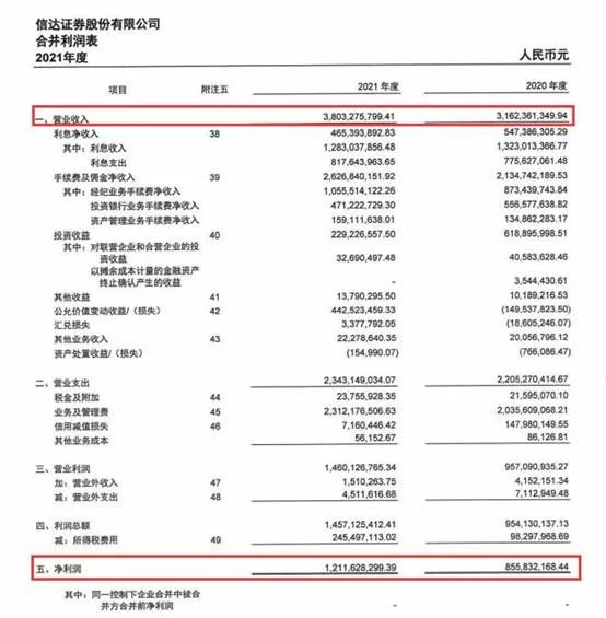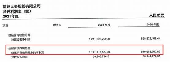 2018年、2019年、2020年、2021年,信达证券实现营业收入分别为16.59亿元、22.23亿元、31.62亿元、38.03亿元;净利润分别为9009.37万元、1.86亿元、8.56亿元、12.12亿元;归属于母公司股东的净利润分别为6995.74万元、2.10亿元、8.20亿元、11.72亿元。