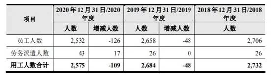 招股书显示,2018年、2019年、2020年,公司用工人数合计分别为2732人、2684人、2575人;其中,员工人数分别为2706人、2658人、2532人;劳务派遣人员的用工数量分别为26人,26人,43人,占用工总数分别为0.95%,0.97%,1.67%。
