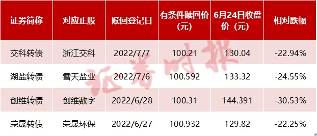 荣晟转债被强制赎回后,6月28日,创维转债也将迎来赎回登记日,7月6日,湖盐转债迎来最后交易日,7月7日,交科转债也将迎来最后交易日。