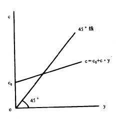 上式表明,短期中的消费可以分为与收入无关的自发消费(由人最低的生理需求决定)以及由收入所引起的引致消费这两部分。白发消费是既定的,引致消费取决边际消费倾向与收入水平。附图说明了短期消费函数。图中横轴OY代表收人,纵轴OC代表消费,45°线是收支相抵线,线上的每一点都表示收入等于支出。